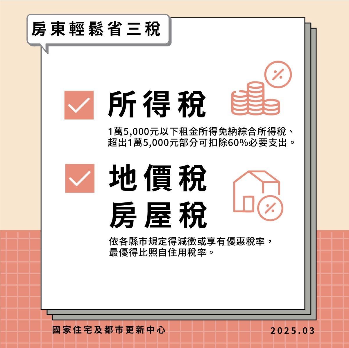 不只租屋族有好處,房東們加入社宅包租代管計畫,還能享有房屋稅、地價稅減徵,甚至還有所得稅每月最高1.5萬元租金免稅額再減徵60%必要扣除額!
